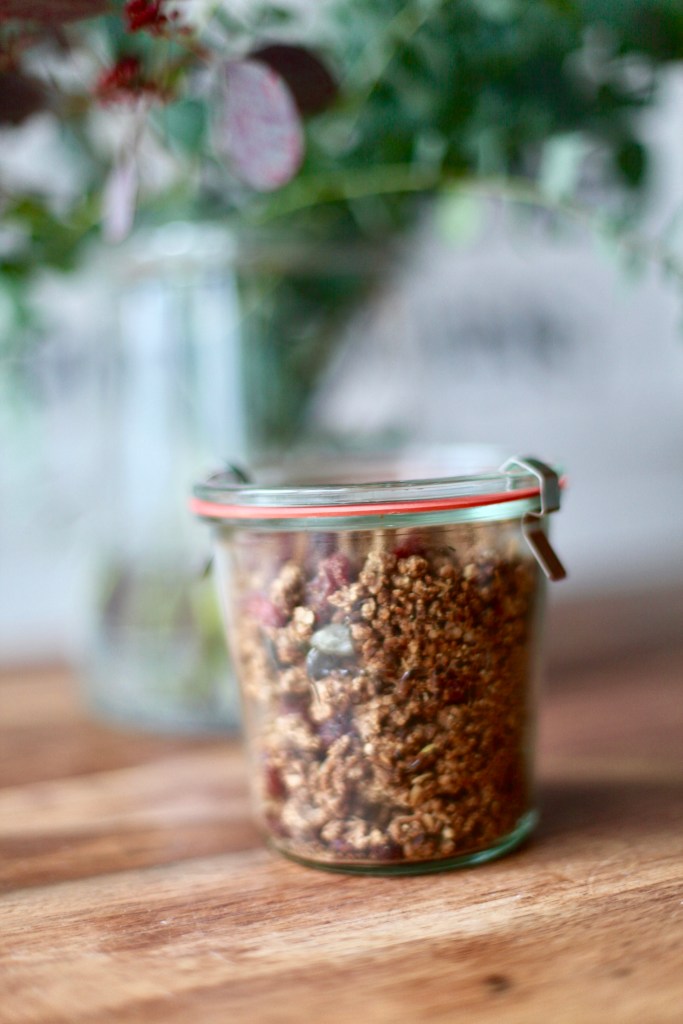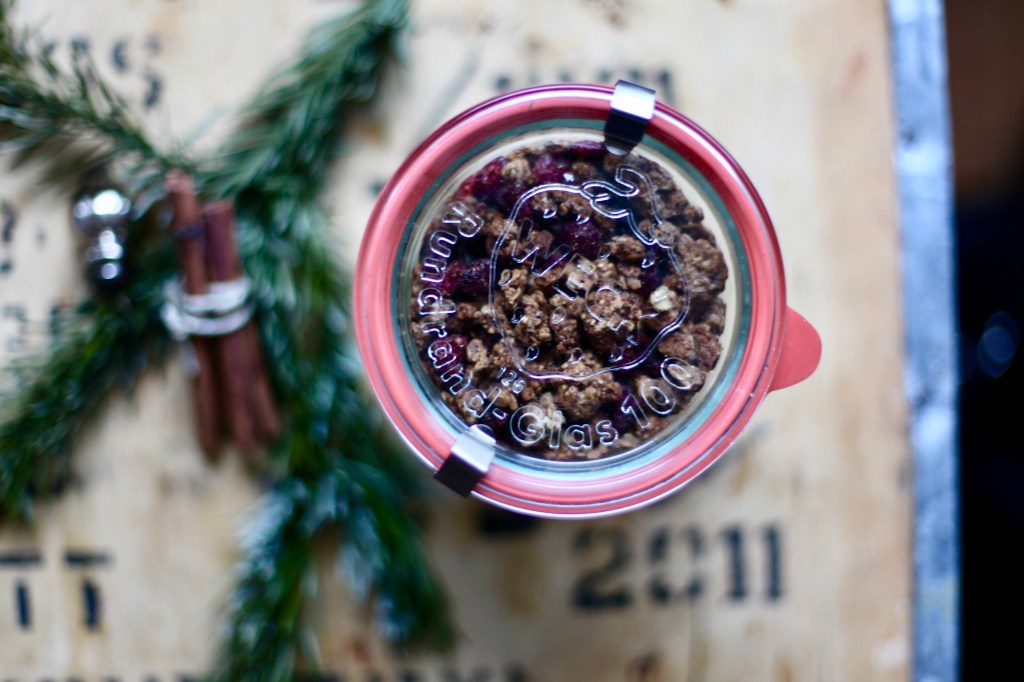 Das Weihnachtsfest rückt immer näher. Viele von uns freuen sich auf ruhige und besinnliche Tage. Wer noch nicht ganz in Stimmung ist, sollte sich unbedingt daran machen mein neues Christmas Granola zu backen. Es geht schneller als Kekse backen und die Gewürze um Zimt, Kardamom und Nelken lassen einen unmöglich nicht in Weihnachtsstimmung kommen. Außerdem eignet sich selbstgemachtes Müsli ausgezeichnet zum Verschenken. Verpackt in einem schönen Vorratsglas von IKEA oder großem Weckglas, ein wunderschönes Geschenk! Nur Achtung, der Countdown Weihanchten läuft und Vorratsgläser für selbstgemachte Geschenke sind meistens vergriffen. Am besten direkt auf leere Vorratsgläser zurückkgreifen, die man selbst geleert hat z.B. Marmelade. Das beugt nicht nur Shoppingstress vor, sondern ist auch noch nachhaltig.