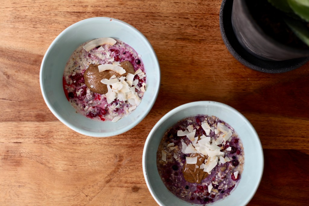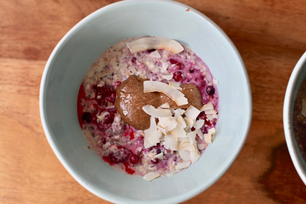 Anschließend noch die TK-Beeren unterheben, sodass sich das Müsli leicht rötlich färbt. Ab damit über Nacht in den Kühlschrank, dann erwartet euch am nächsten Morgen ein toll aromatisches Beeren Bircher Müsli. Als Topping ist Mandelmus bei kaum einer Frühstücksvariante verzichtbar, zusammen mit den Kokoschips ist es auch beim Beeren Bircher Müsli mehr als nur ein Hingucker. Guten morgendlichen Appetit!