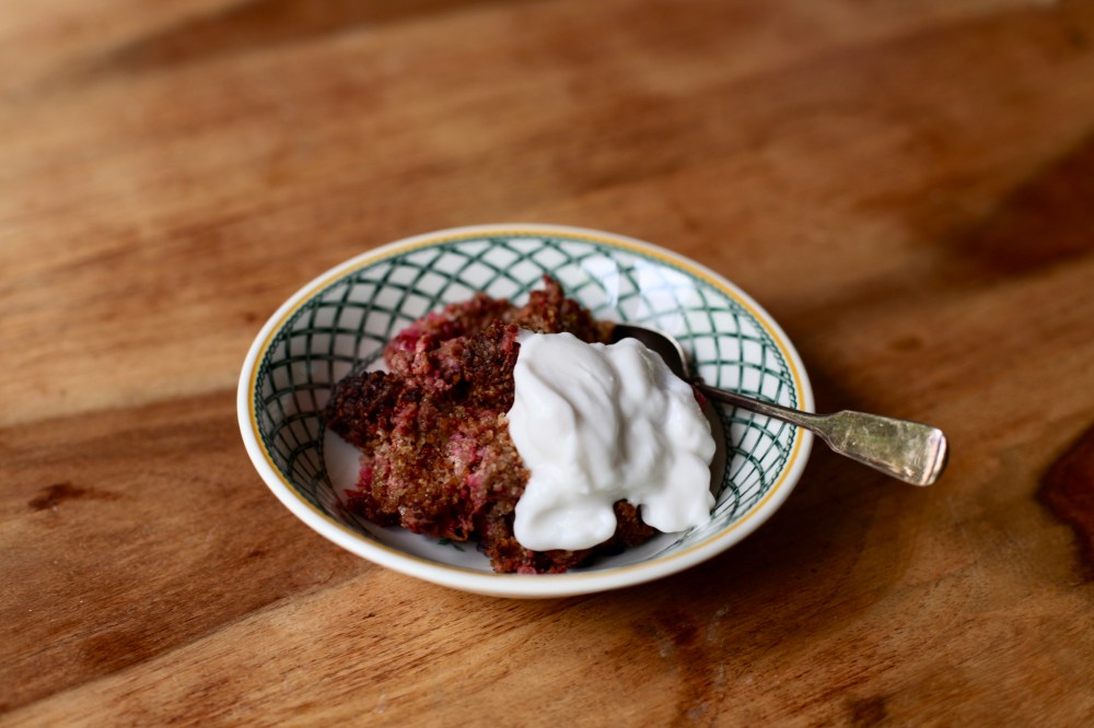 Rhabarber Crumble am besten noch lauwarm mit kaltem Kokosjoghurt oder Kokoseis genießen.