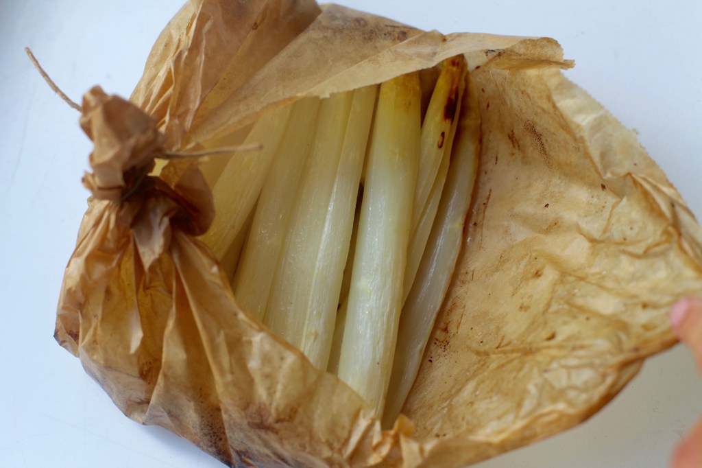 Ein Backpapier ausbreiten und die geschälten Spargelstangen in der Mitte auftürmen. Ein wenig Olivenöl drüber geben und mit Salz bestreuen. Anschließend mit einem Küchengarn zu einem Päckchen schnüren.