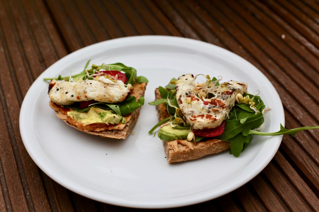 Anschließend sollte der Belag für den Burger präpariert werden: Salat und Sprossen waschen, Avocado und Tomaten in Scheiben schneiden. Den Halloumi der Länge nach halbieren, sodass er nicht zu dick ist.