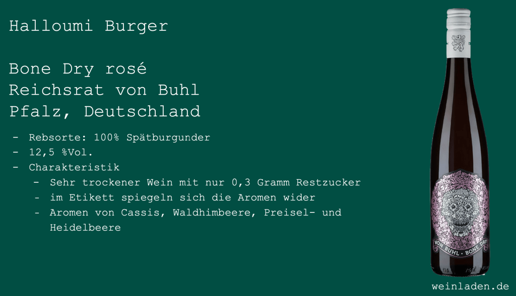 Wie bereits angekündigt ist mein Geschmackssinn voll und ganz auf das Grillen ausgerichtet, sodass ich euch heute ein weiteres Rezept für die „Outdoorküche“ empfehlen möchte. Als Fleischalternative heute der Halloumi Käse. Dieser Käse schmeckt am besten vom Grill und zu einem absoluten Highlight wird er, wenn ihr ihn als Burger zubereitet. Ein weiteres Mal wird dieses Gericht durch das perfekte Wine Pairing des Weinladen St.Paulis ergänzt. Steph hat heute für euch den Bone Dry Rosé vom Weingut Reichsrat von Buhl ausgewählt. Sehr spannender Wein zu einem richtig leckeren Essen – eben „Ziemlich beste Freunde“.