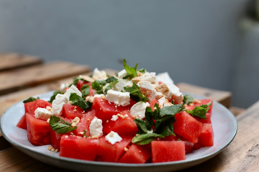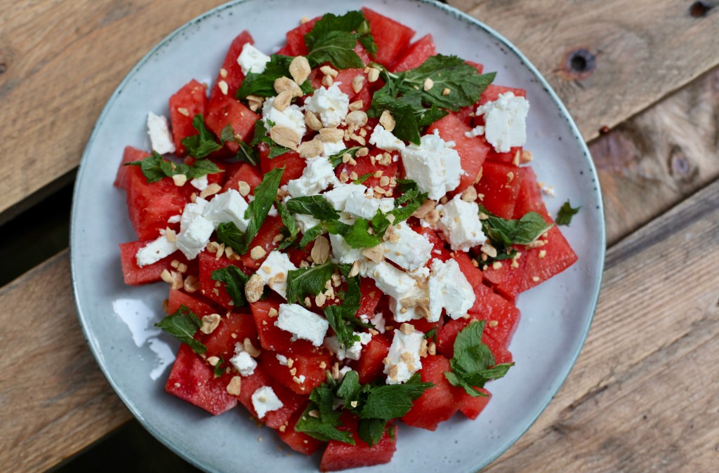 Wer denkt die Wassermelone bestehe nur aus Wasser, liegt aber nur fast richtig. Wie der Name schon sagt besteht sie zu 95,8 Prozent aus Wasser. Der Rest setzt sich aus 0,2 % Fasern, 0,2 % Protein, 0,2 % Fett, 3,3 % Kohlenhydraten, 0,3 % Mineralstoffen sowie Vitamin A und C zusammen. Insbesondere im Sommer ist die Frucht also ein super Durstlöscher. Zu diesem Zweck wurde die Wassermelone jahrhundertelang in der Kalahari Wüste als wichtige Wasserquelle genutzt. Heute aber einfach nur zum Genießen: der Wassermelonen-Feta Salat mit chrunchy Erdnüssen und frischer Minze.