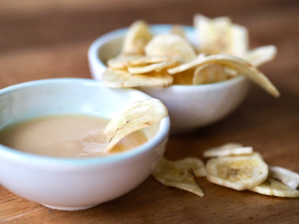 Vollständig auskühlen lassen und wann immer Sie jetzt der Snack-Hunger überkommt, in die Erdnussbutter dippen und genießen. Luftdicht verschlossen halten sich die Bananenchips ca. sechs Wochen.