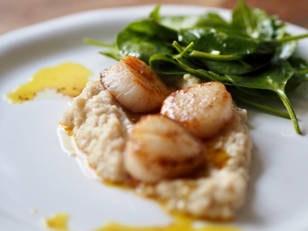 Jetzt nur noch alles schön anrichten. Dazu 2-3 EL des Blumenkohpürrees auf die beiden Teller verteilen, glatt streichen und jeweils drei Jakobsmuscheln drauf setzen. Mit 1 EL des Curryöls beträufeln und den angemachten Spinatsalat an der Seite platzieren.