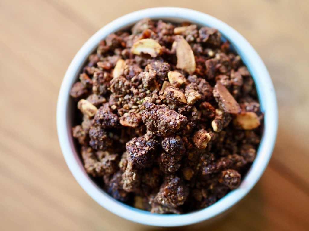 Das Schoko Granola harmoniert so ziemlich mit jeder Frühstücksbowl als Topping, mir schmeckt es aber auch sehr gut pur oder einfach nur mit kalter Hafermilch…