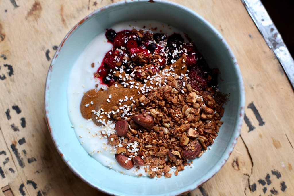 Für die Granola Frühstücks Bowl einfach den Joghurt eurer Wahl als Base verwenden, gemischte rote Beeren darauf verteilen, Nussmus nicht vergessen und als Highlight das selbstgemachte Granola großzügig über allem verteilen.